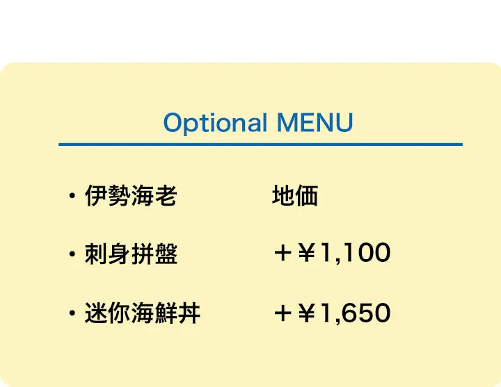 ¥2,200+ 鮑魚大通燒 ¥3,300+ 海膽生魚片 ¥3,700 -